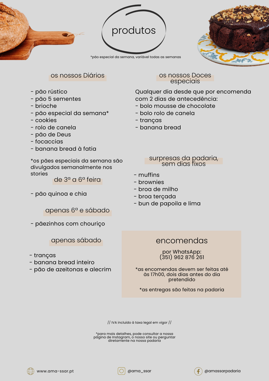 Semanalmente, ao domingo, divulgamos nas nossas redes (Instagram e Facebook) os produtos disponíveis para a semana seguinte, e pode encomendá-los enviando-nos uma mensagem por whatsapp (+351 962 876 261).